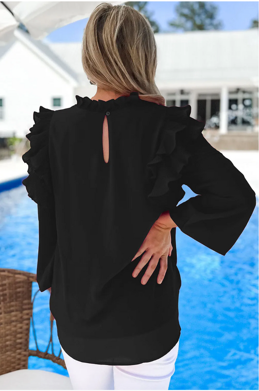 Black Button Keyhole Back Pleated Ruffle Trim Blouse