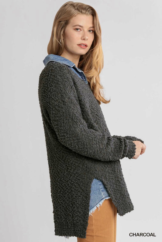 Long Sleeve V-Neck Soft Knit Pullover Sweater with Side Slits