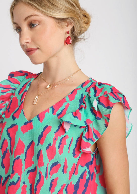 Mint Abstract Print V-Neck Top with Double Layer Ruffle Sleeves