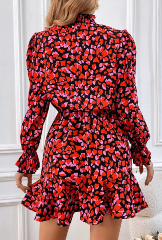 Red Valentines Day Heart Shape Print Long Sleeve Mini Dress