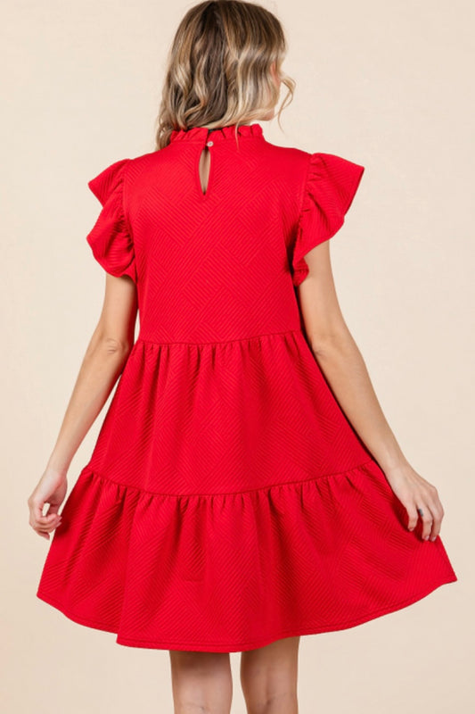 White Frill Mock Neck Sleeveless Tiered Floral Dress
