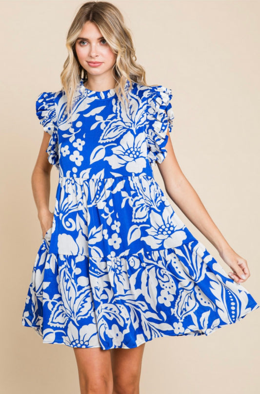 Blue and White V-Neck Collared Dress with Ruffle Sleeves and Fray Details