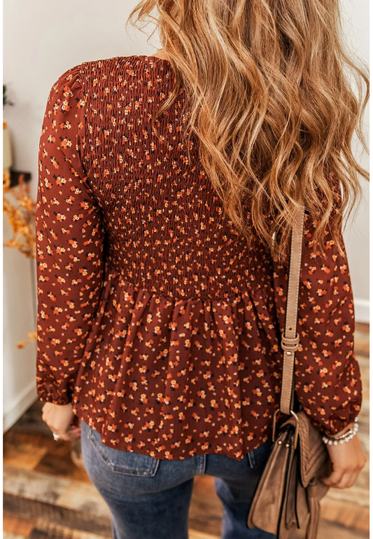 Boho Floral Smocked Bust Ruffled Peplum Blouse