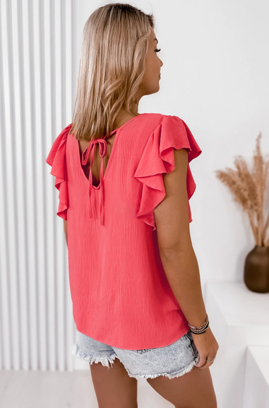 Red Solid V Neck Ruffle Sleeve Loose Top