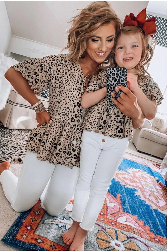 Leopard Button Front Ruffled Family Matching Mom's Tunic Top