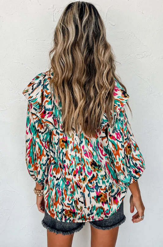 Multicolor Abstract Print 3/4 Puff Sleeve Ruffle Blouse