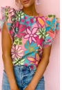 Multicolor Vibrant Floral Print Trimmed Ruffle Sleeve Blouse